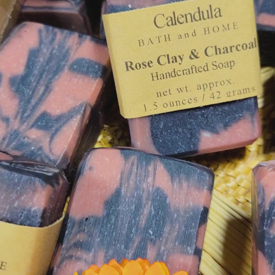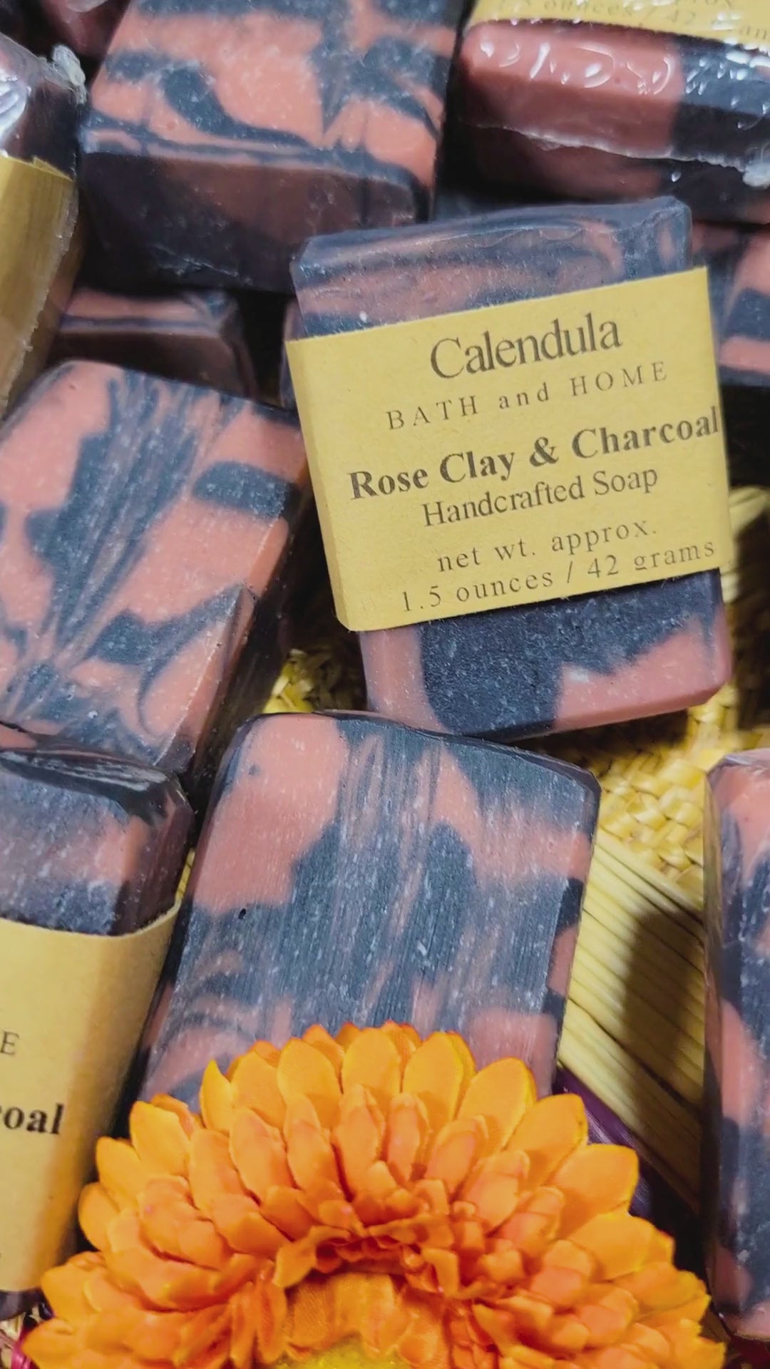 Ingredients: Calendula Infused Extra Virgin Olive Oil, Coconut Oil, Distilled Water, Coconut Milk, Sodium Hydroxide*, Cocoa Butter, Apricot Kernel Oil, Sweet Almond Oil, Shea Butter, Castor Oil, Rose Clay, Activated Charcoal, Sodium Lactate, Kosher Salt