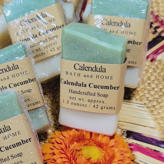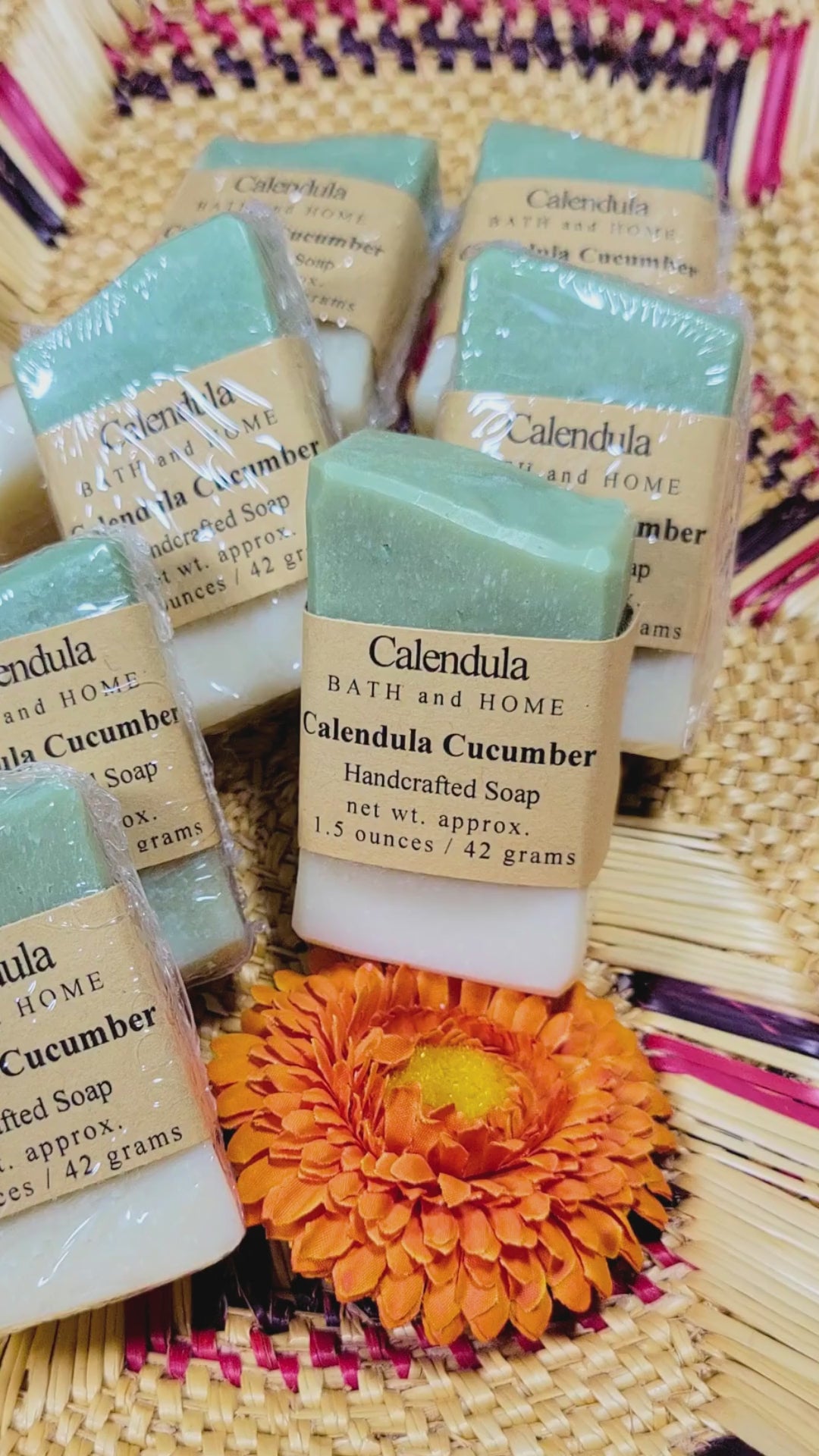 Mild Calendula Cucumber Soap is made with calendula infused olive oil and cucumber. This refreshing unscented travel soap bar produces a clear and mild lather that is ideal for all skin types.