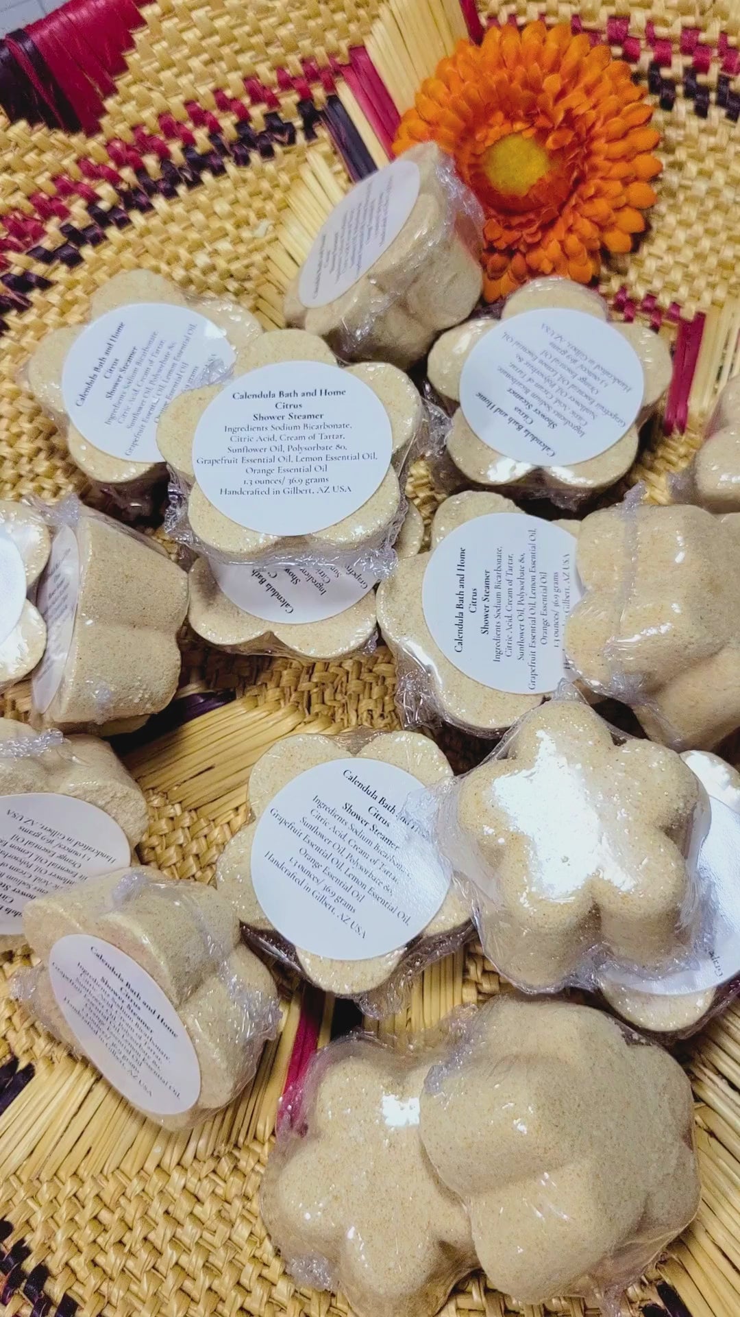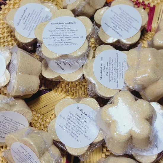 Citrus Shower Steamers are infused with pure Grapefruit, Lemon, and Orange Essential oils.