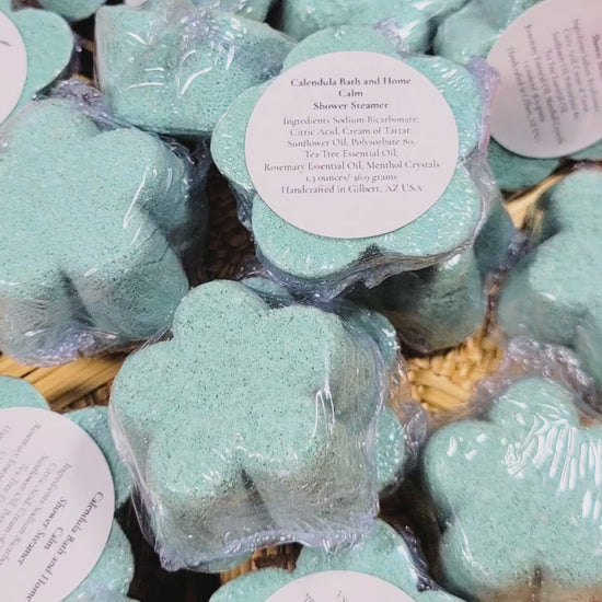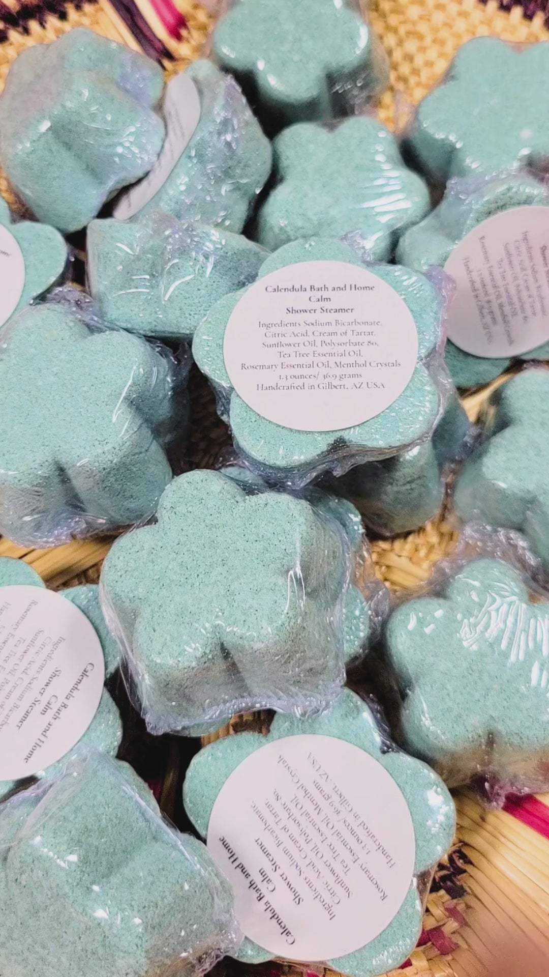 Calm Shower Steamers are made with pure Tea Tree and Rosemary essential oils.